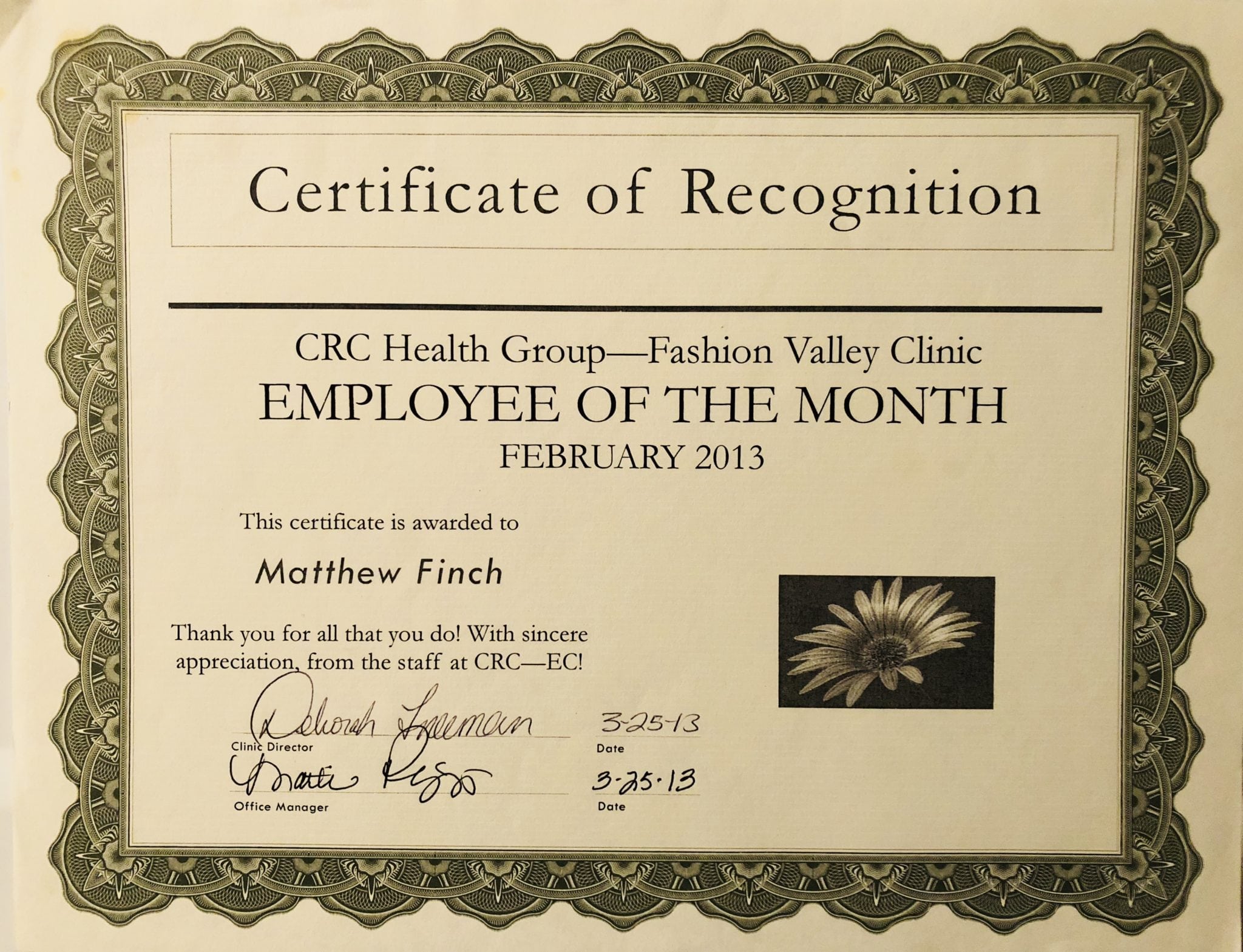 Awarded Employee of the Month at CRC Health Group — Fashion Valley Clinic, an Opioid Treatment Program (OTP) that provides Medication-Assisted Detox and Treatment 03/25/2013).